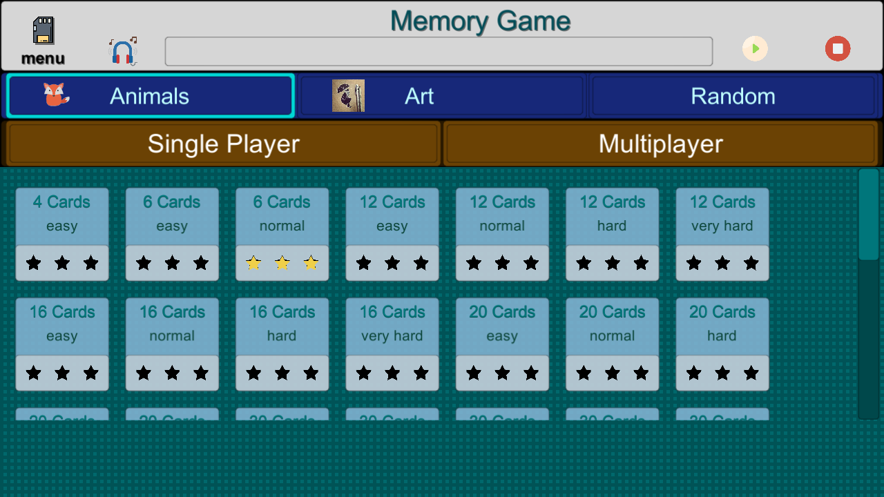 در حالت Multiple Player ، به نوبت کارتها را ورق بزنید ، آنها را بخاطر بسپارید ، آنها را به نوبت جفت کنید تا امتیاز بگیرند و یک فرصت اضافی بدست آورند. سرگرم کننده است.