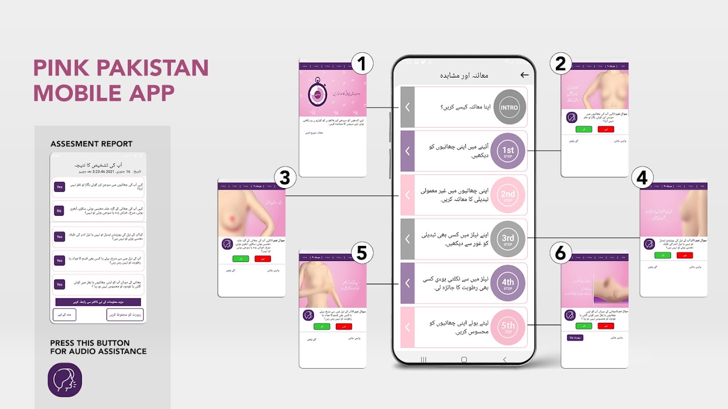 تشخیص به موقع سرطان پستان می تواند زندگی های بی شماری را که زنان هر ساله از دست می دهند نجات دهد. برای اطمینان از تأثیر این آگاهی مورد نیاز ، ما یک برنامه تلفن همراه به نام Pink Pakistan (پاکستان صورتی) ایجاد می کنیم که می تواند با حاشیه رانترین زنان پاکستان تماس بگیرد. این نرم افزار Pink Pakistan نه تنها به آموزش زنان در مورد سلامتی آنها بلکه برای کاهش خطرات سرطان پستان نیز تمرکز دارد. این برنامه ویدیویی مرحله به مرحله از روند خودآزمایی سرطان پستان را ارائه می دهد تا به کاربر کمک کند تا روند را به روشی مناسب و دقیق انجام دهد. در هر مرحله یک سوال مربوط به انجام معاینه وجود دارد. کاربر در هر مرحله به س answerال پاسخ می دهد و در پایان مراحل آزمون گزارش خود ارزیابی برای راهنمایی کاربر تهیه می شود. این امر ضمن دستیابی به منابع لازم که مدیریت و درمان موارد مثبت سرطان پستان را تسهیل می کند ، به افزایش آگاهی از بیماری کمک می کند.