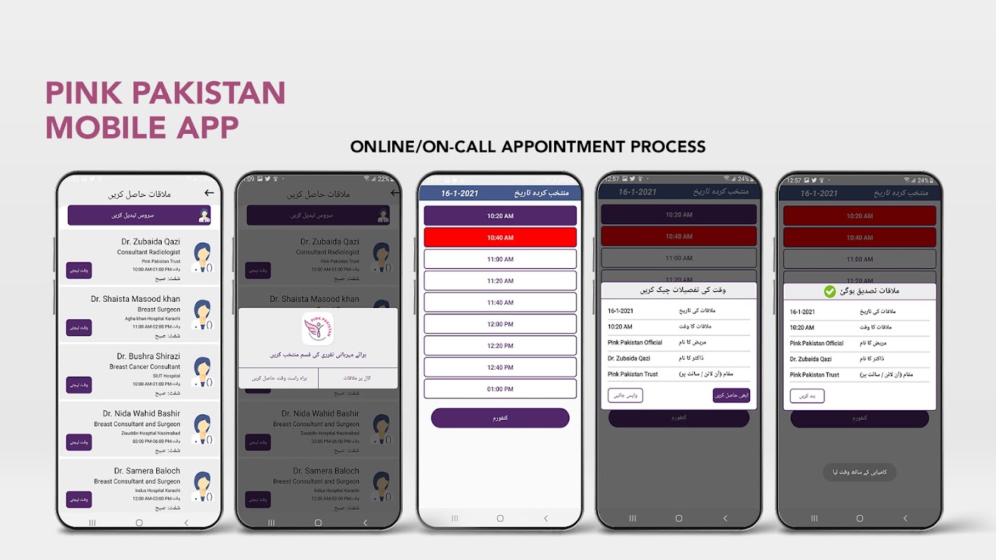 برنامه Pink Pakistan با هدف از بین بردن سرطان پستان در سراسر پاکستان از طریق آموزش ، تشخیص و درمان به موقع است. این برنامه دارای یک سیستم قرار ملاقات بصورت آنلاین است که بیماران را از طریق کانال مکانیزم ارجاع جهت بدست آوردن درمان های مورد نیاز در مراحل اولیه هدایت می کند.