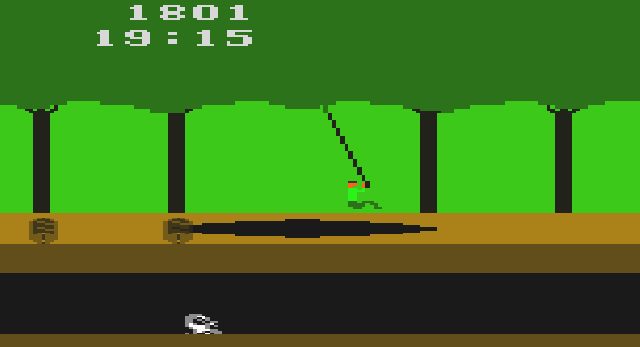 The player must maneuver a character (Pitfall Harry) through a maze-like jungle in an attempt to recover 32 treasures in a 20-minute time period. Along the way, he must negotiate numerous hazards, including pits, quicksand, rolling logs, fire, rattlesnakes, scorpions, and crocodiles. Harry may jump over or otherwise avoid these obstacles by climbing, running, or swinging on vines. Treasure includes gold and silver bars, diamond rings, and bags of money. Under the jungle there is a tunnel which Harry can access through ladders found at various points. Travelling though the tunnel moves forward three screens at a time, which is necessary in order to collect all the treasures within the time limit. However, the tunnels are filled with dead-ends blocked by brick walls, forcing the player to return to the surface at one of the ladders, and try to find a way around again, thus wasting time. The tunnels also contain scorpions, which can harm Harry.