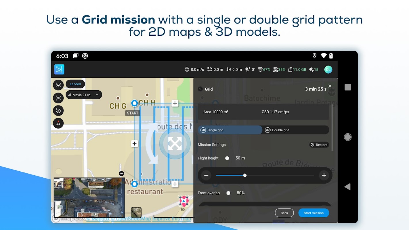 2- Start and fly - Track your mission's progress with the map view or monitor live with camera view. PIX4Dscan provides live telemetry data such as altitude, speed, camera angle and more.