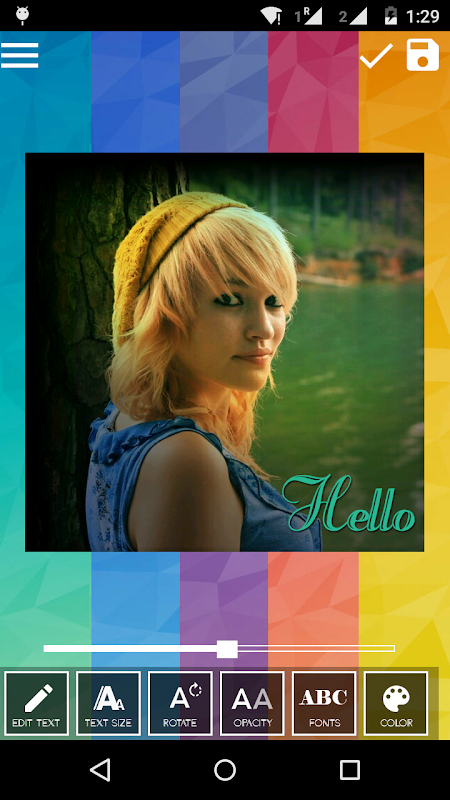 ** Text your pics with text tool which have many options like beautiful fonts, font size, color, opacity and rotate.