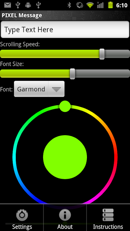 این برنامه اجازه می دهد تا شما را به نمایش متن پیمایش بر روی صفحه نمایش پیکسل LED است. شما می توانید فونت، رنگ، اندازه فونت، و سرعت پیمایش را تغییر دهید. شما می توانید در پیام را تایپ، به اشتراک گذاری یک ایمیل موجود به این برنامه، و یا متن را از یک خوراک توییتر.