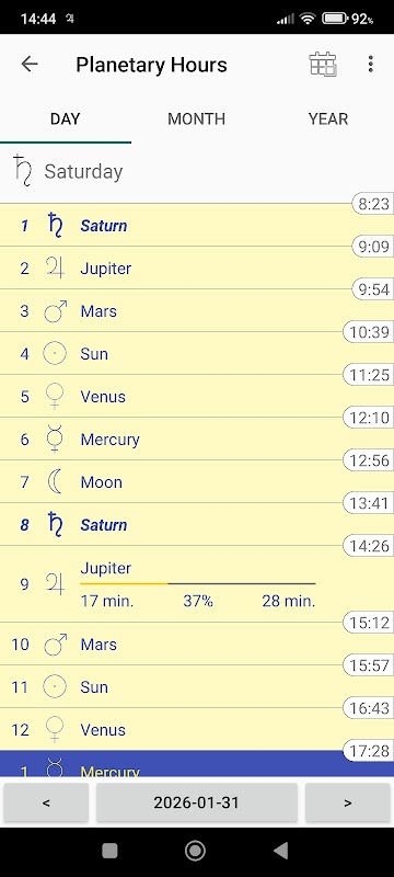 ساعتهای سیارهای و تاریخ و زمان فازهای ماه، انقلابها و اعتدالها را برای یک مکان مشخص نشان میدهد. روز صحیح هفته را برای رویدادهای آسمانی، بر اساس سیستم ساعات سیاره ای نشان می دهد (زمانی که زمان بین نیمه شب و طلوع خورشید یک روز با تقویم معمولی متفاوت است).