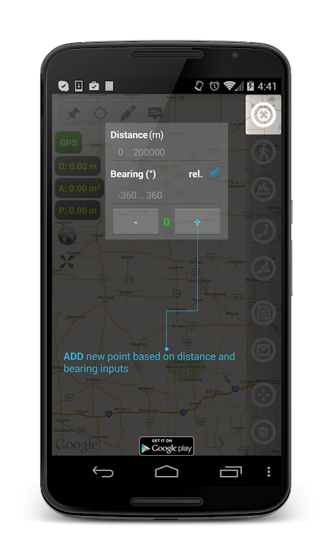 این اجازه می دهد شما را به انجام مساحت، فاصله، محیط و زاویه اندازه گیری سریع در نقشه با استفاده از منابع ورودی های مختلف. شما می توانید اندازه گیری با لمس صفحه نمایش انجام. اضافه کردن راه نقاط با مختصات جغرافیایی (طول و عرض جغرافیایی)؛ نقاشی بر روی نقشه؛ با استفاده از ردیابی GPS؛ رها کردن پین با فاصله دقیق و تحمل از آخرین نقطه.