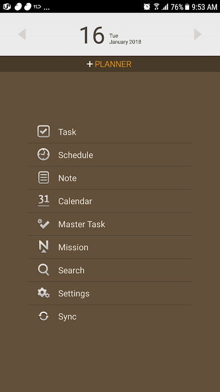 + PLANNER در 3 مرحله کار می کند: پیدا کردن، برنامه ریزی و عمل کردن. از Task، Schedule، Master Task، Notes، Calendar، Search، Mission، Goldensaying، Backup، Sync و ScreenLock تشکیل شده است.