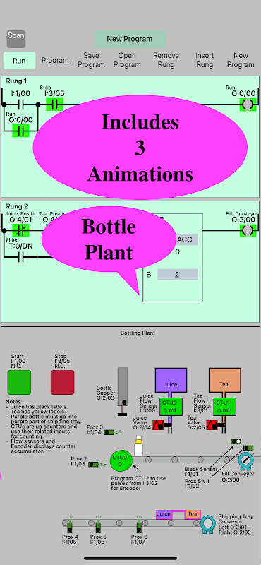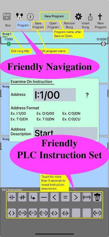 این برنامه به دانشجویان PLC (برق، کارآموزان و دانشجویان) اجازه می دهد تا تکالیف کوچک خود را با استفاده از تلفن خود آزمایش کنند و برنامه نویسی اولیه PLC را کشف کنند. دارای دستورالعملهای ورودی، خروجیها، تایمرها، شمارندهها، چفتها، باز کردن قفلها و بلوکهای مقایسه است، هر پله کاملاً با 6 دستورالعمل طولانی و 4 دستورالعمل عمیق قابل تنظیم است.