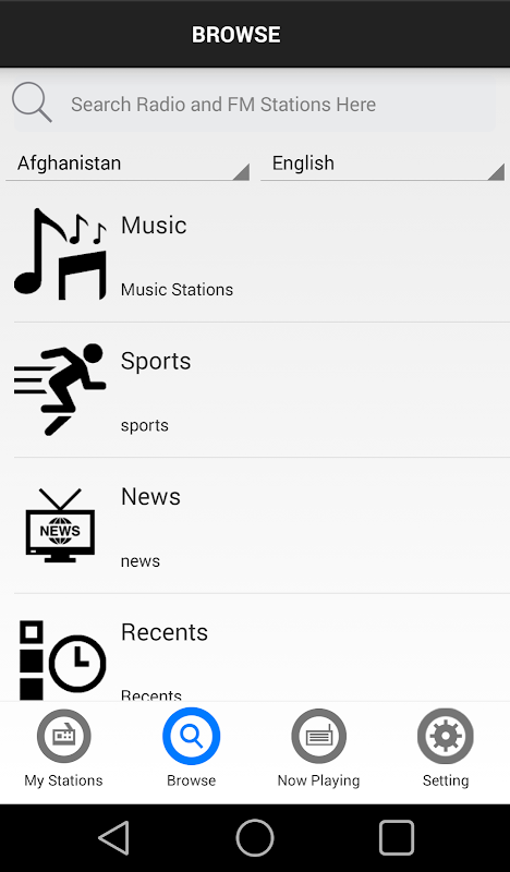 To support so many radio stations but keep the app easy to use, we simply gave each radio station their own category. So if you wanted to listen to a sports radio station, you would go on browse and then “Sports” and listed would be all the sport radio stations. You can also search for radio stations based on Location, language and recommended.