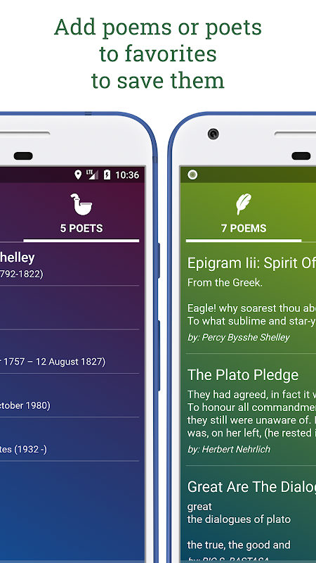 Poemhunter apps library has more than 100,000 poets including Maya Angelou, Roberts Frost, William Shakespeare, Emily Dickinson, Pablo Neruda, Edgar Allan Poe, Walt Whitman, William Wordsworth, John Keats, Langston Hughes, Khalil Gibran, T. S. Eliot etc.