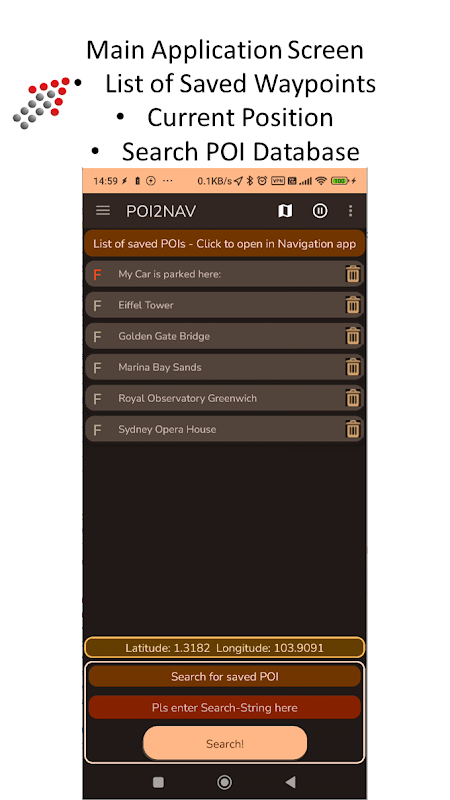 🌍 با فرآیند دست و پا گیر جابجایی بین چندین برنامه ناوبری، جستجوی Waypoints و شروع ناوبری خداحافظی کنید. با POI-2-NAV، این کار به همین سادگی است: