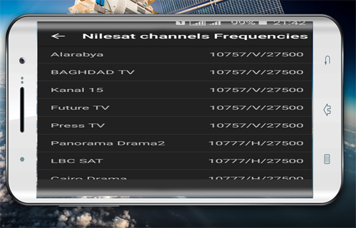 SatFinder (Satellite Finder) satellite finder app is a tool which will help you to set up satellite dish. It will give you azimuth, elevation and LNB tilt for your location (based on GPS) and chosen satellite from list. The result is shown both as numeric data and graphical on google maps. It has also built in compass which will help you to find proper satellite azimuth. It also can use augmented reality to show where is satellite on camera view.