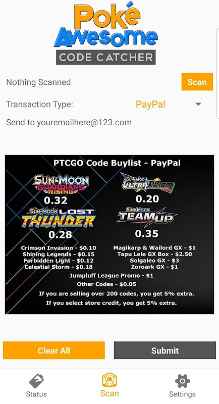 Do you have Pokemon Code Cards that you don't use? Do you want to turn that into more Pokemon cards, or better yet, money?!?! Poke Awesome Code Catcher allows you to scan your Pokemon QR codes quick and easy and you get to choose how you'd like to be compensated. This app will always be free and you will receive bonuses based on how many codes you have to scan in.