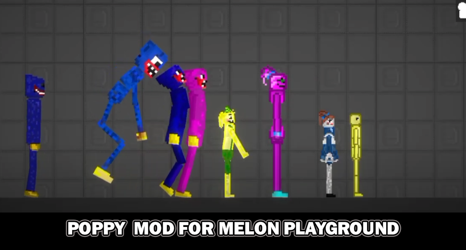 The mod will be a great game for thrill-seekers and those who like Mommy Long Legs. Alternatively, you can install the Huggy Wuggy Melon playground mod. The gamer accidentally ended up in the gloomy and creepy locations of Poppy Playtime 2, where a dangerous and evil entity roams. This is a huggy-wuggy monster waiting for its next victim. Vengeful toys are hiding in an abandoned building, which instill fear in random visitors. What are these toys? You know them for sure - they are Kissy Missy, Poppy and others.