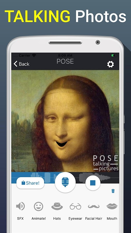 با ضبط پیام ، تصویری از یک گفتگوی چهره تهیه کنید. با فشار یک دکمه حالت صورت را تغییر دهید! برچسب های خنده دار اضافه کنید. خلاقیت های خود را به عنوان فیلم ذخیره کنید و آنها را در رسانه های اجتماعی ارسال کنید! POSE نرم افزار تصاویر نهایی صحبت کردن است.