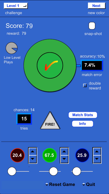 این برنامه یک چالش تطبیق رنگ سرگرم کننده است که مستلزم تولید یک رنگ هدف تصادفی بر روی صفحه است که از شدت های خاصی از نور قرمز، سبز و آبی (RGB) ترکیب شده است. هدف بازی یافتن یک تطابق معقول با رنگ مورد نظر با تعیین میزان سه شدت RGB در تعداد محدودی از تلاش است. هر بار که یک مسابقه قابل قبول پیدا می کند، امتیازات تعلق می گیرد. این ممکن است در ابتدا یک کار بی اهمیت به نظر برسد، اما با نزدیک شدن به دقت مورد نیاز مسابقه، به چالشی دشوارتر تبدیل می شود، که مستلزم استفاده قابل توجه از مهارت ها و توانایی های مغز چپ و راست برای یافتن سریع مسابقات است. برای گل زدن کافی است ما این برنامه را یک بازی قدرتمند برای تطبیق رنگ می نامیم، زیرا برخلاف برخی از دیگر برنامه های تطبیق رنگ واقعاً اساسی موجود، با این برنامه سطح بازی را افزایش می دهید. سپس برای بیرون آمدن با بالاترین امتیاز به ترکیبی برنده از هر دو مهارت و تاکتیک نیاز دارد. این برنامه برای سنین 10 سال به بالا مناسبتر است، اگرچه افراد جوانتر نیز ممکن است بتوانند با چالشها مقابله کنند.