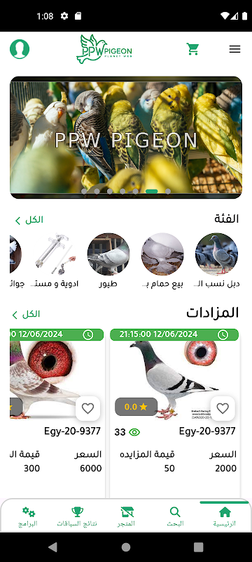 6. نمایش برخی از محصولات برای فروش از طریق وب سایت از جمله (پرندگان، حلقه کبوتر، داروها، جوایز و کاپ، ساعت مسابقه پی پی و ...)، چاپ گواهی شعب و نوشتن نشان پرنده.