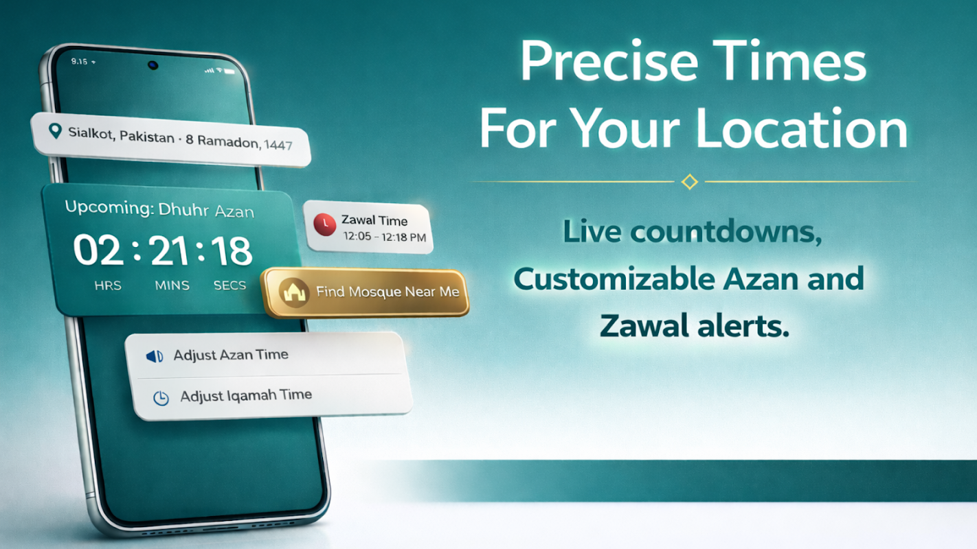 مهم نیست کجا زندگی میکنید یا سفر میکنید، این برنامه زمان دقیق نماز را بر اساس موقعیت مکانی شما، از جمله فجر، ظهر، عصر، مغرب و عشا، ارائه میدهد. هشدارهای زیبای اذان و یادآوریهای به موقع را دریافت کنید تا دیگر هرگز نمازی را از دست ندهید. همچنین میتوانید زمانهای جماعت را با توجه به مسجد محلی خود برای حداکثر دقت تنظیم کنید.