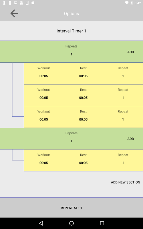 Let's say you wanted to repeat this entire cycle 3 times, you would then input 3 in the green bar above. You will cycle through this stack of intervals 3 times before moving on to your next activity.