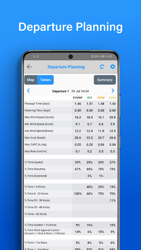 برنامهریزی حرکت، به سرعت شرایط آب و هوایی دریایی پیشبینی شده را که در طول مسیر خود در صورت حرکت در روز ۱، ۲، ۳ یا ۴ با آن مواجه خواهید شد، خلاصه میکند. از این دادهها برای انتخاب تاریخ حرکت ایدهآل، هر بار برای قایق بادبانی یا قایق موتوری خود استفاده کنید.