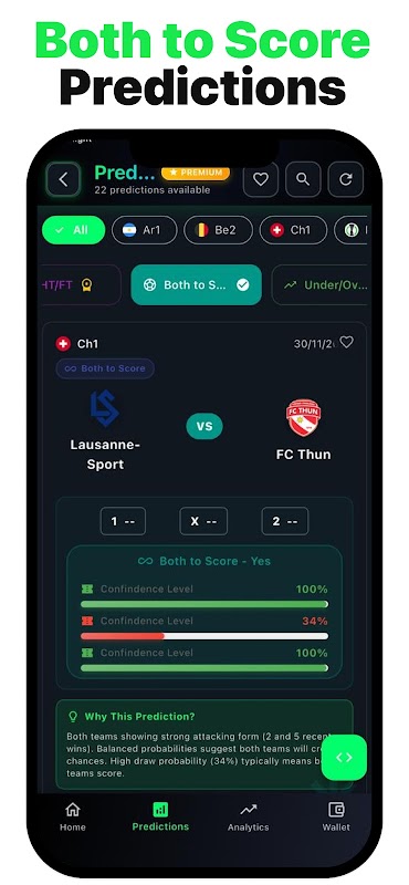 با سیستم مبتنی بر سکه ما از PrediKick بیشتر بهره ببرید. روزانه سکه به دست آورید، ویدیوهای دارای پاداش را تماشا کنید، و قفل پیش بینی های انحصاری با اطمینان بالا و تجزیه و تحلیل پیشرفته را باز کنید - بدون نیاز به پول واقعی.