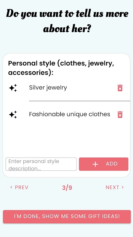 توصیههای شخصیشده: در مورد گیرنده - رابطه آنها با شما، سن و علایق به ما بگویید. PresentPerfect از الگوریتمهای Ai برای تولید فهرستی از ایدههای هدیه متفکرانه و مرتبط استفاده میکند و از یک شگفتی معنادار و گرامی اطمینان میدهد.