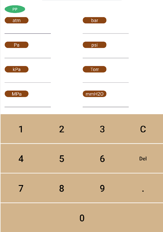 این برنامه واحدهای فشار atm، bar، Pa، kPa، MPa، psi، Torr، mmH20 را به واحدهای دیگر تبدیل می کند.