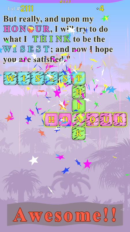 در هر سطح ، قسمتی از داستان با چند کلمه گم شده به شما ارائه می شود که می توانید با حل جدول کلمات متقاطع در زیر متن آن را پر کنید. هر حرفی را که پر می کنید در خود متن ظاهر می شود. ما کنترل بازی را بسیار آسان کردیم ، فقط به یک لمس روی هر حرف زیر جدول کلمات متقاطع نیاز دارد. همه کلمات در رنگهای منحصر به فرد رنگ آمیزی شده اند ، حروف خارج از جدول کلمات متقاطع نیز رنگ آمیزی شده اند ، بازیکن باید حروف را با لمس آنها به ترتیب صحیح در کلمات پر کند. هر حرفی که بازیکن لمس می کند ، در اولین کلمه موجود در یک کلمه با همان رنگ ، پرش می کند. اگر حرف در مکان اشتباه باشد ، با یک نقطه زرد مشخص می شود که چشمک می زند. بازیکن به راحتی می تواند قرار دادن یک حرف را در مکان اشتباه تصحیح کند ، با لمس آن ، به بیرون پرش می کند و سپس بازیکن باید حرف راست متعلق به مکان آزاد بعدی را در کلمات لمس کند. حروف متعلق به دو کلمه با خطوط مورب ، با رنگ از هر دو کلمه مشخص شده اند. وقتی کاربری چنین حرفی را لمس می کند ، درست به جای درست خود می پرد.