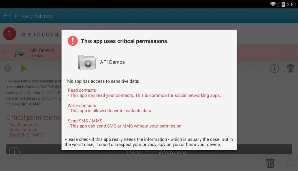 Does your smartphone host spy apps? Find it out with Privacy Advisor. The app lists all permissions and highlights critical apps clearly. Suspicious apps can be instantly uninstalled.
