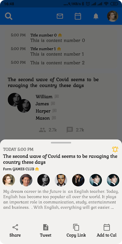 7. Up Coming For You - رویدادهای برنامه ریزی شده را نمایش دهید و با کلیک بر روی نماد notify به کاربر اجازه دهید تا اعلان ها را تنظیم کند. کاربران می توانند با کلیک بر روی نماد تقویم در بالای صفحه اصلی ، به اخبار خبری دسترسی پیدا کنند.