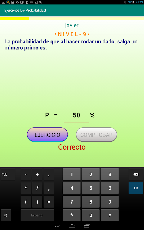 برنامه "احتمال" تمرینات احتمالی اساسی را ارائه می دهد ، شامل 10 سطح است که هر بار 5 تمرین صحیح به صورت سری انجام می شود.