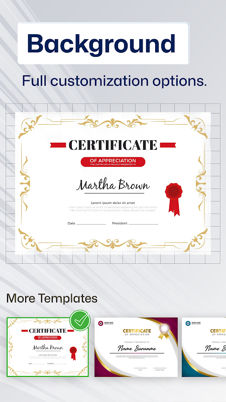 Certificate Maker & Editor ابزار قدرتمندی است که به شما کمک می کند تا طرح های گواهی حرفه ای متناسب با نیازهای خود ایجاد کنید. چه به یک گواهی دیجیتال برای استفاده آنلاین یا یک جایزه قابل چاپ برای رویدادها یا دستاوردها نیاز داشته باشید، این برنامه سازنده گواهی، الگوهای گواهی قابل تنظیم برای هر هدفی را ارائه می دهد.