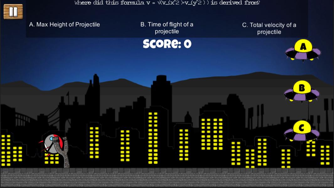 The goal of the game is to hit the enemies with the projectile. The enemies varies depending on the level. Bird for the easy level, Crow for the average level and UFO for the hard level. The player will be given questions and hitting the correct letter of the enemy would result to a score. There are 5 questions per each level which are randomized. After passing each level, there will be rewards such as different catapult and projectile.