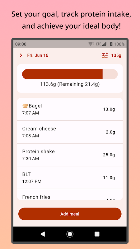 با وارد کردن نام غذا و مقدار پروتئین آن، وعده های غذایی خود را ثبت کنید. همانطور که غذای خود را ثبت می کنید، غذا به طور خودکار در لیست غذاهای شما ذخیره می شود.