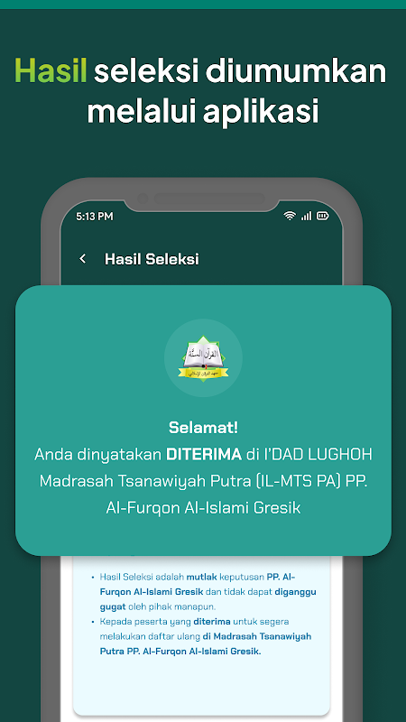 پس از طی مراحل ثبت نام و آزمون آنلاین، کاربران درخواست اطلاعاتی در مورد وضعیت پذیرش دانشجویان آینده دریافت خواهند کرد. این اطلاعات شامل تصمیم گیری در مورد پذیرش یا عدم پذیرش دانش آموزان آینده نگر در مدرسه شبانه روزی اسلامی الفرقون اسلامی گرسیک است. بنابراین، برنامه PSB نه تنها به عنوان وسیله ای برای ثبت نام، بلکه به عنوان یک کانال ارتباطی موثر عمل می کند که نتایج را به سرعت و شفاف در اختیار کاربران قرار می دهد.