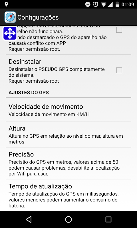 * Caso necessite é possível desativar o GPS Nativo do sistema Android, deixando que só o PSEUDOGPS envie a localização para os aplicativos;