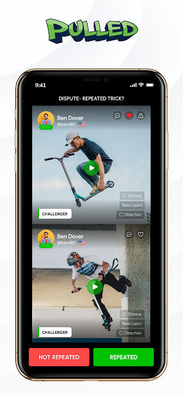 در این بازی دوچرخه، اسکیت یا اسکوت، بازیکنان نمیتوانند یک ترفند را تکرار کنند، مگر اینکه روی مانع دیگری باشد. هر گونه اختلاف نظر در طول این مسابقه اسکیت، اسکوتر یا دوچرخه توسط سایر کاربران برنامه رای گیری و حل می شود. از فید ویدیویی برای تعیین مقصر استفاده می شود. بازیکنی که رای منفی داد، "شکست" دریافت می کند. هنگامی که این بازی با پرش های خاکی به پایان رسید، می توانید مجموعه ای از بازی ورزشی اکشن خود را در هر شبکه اجتماعی به اشتراک بگذارید یا حتی آن را به نمایه خود در Pulled اضافه کنید تا مردم از آن لذت ببرند.