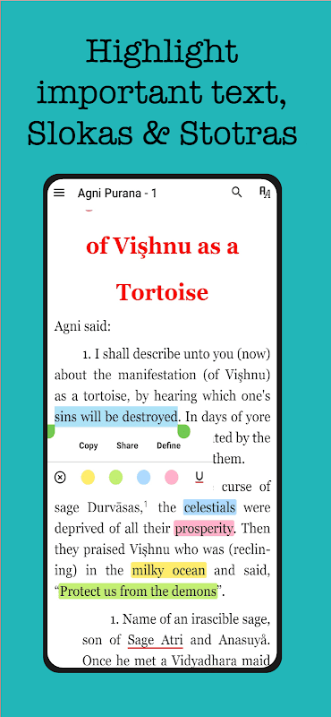 برنامه Puranas از طریق فن آوری پیشرفته خرد باستانی هند را برای نسل های جدید به ارمغان می آورد. بسیاری از برنامه های دیگر PDF اسکن شده را منتشر می کنند که برای خواندن در دستگاه های تلفن همراه بهینه نیست. درعوض ، Puranas در متن دیجیتالی واقعی با قالب دقیق موجود است. کاربران می توانند اندازه قلم ها را تنظیم کرده و از حالت روشن یا تاریک برای خواندن در طول روز یا شب استفاده کنند.
