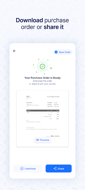 ➤ می توانید PDF سفارش خرید را به دستگاه خود بارگیری کنید ، از طریق ایمیل آن را ارسال کرده یا فوراً آن را با تهیه کننده خود به اشتراک بگذارید.