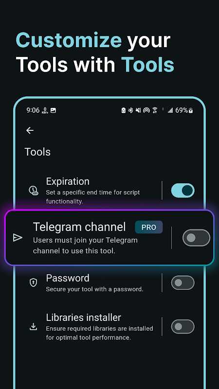 با گزینه های امنیتی قابل تنظیم PyPrivate، ابزارهای خود را کنترل کنید. رمز عبور اضافه کنید، تاریخ انقضا را تعیین کنید یا دسترسی کاربران مشترک کانال تلگرام خود را محدود کنید. محافظ ابزار خود را متناسب با نیازهای خاص خود تنظیم کنید.
