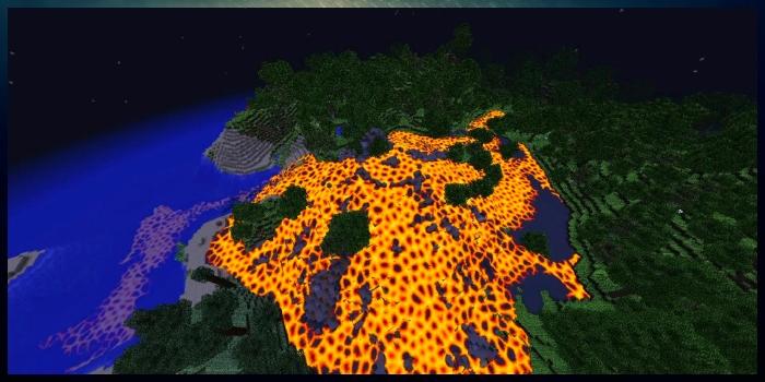This mod introduces dynamic volcanos that erupt from the ground and slowly build up over time. Volcanos are environmental hazards: they eject destructive lava bombs and volcanic lava can flow for very long distances, filling caves, lakes, ravines, or even oceans. As lava flows it forms a smooth surface and eventually cools and hardens into basalt.