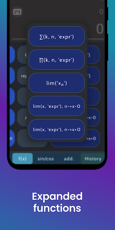 توجه: می توانید از صفحه کلید خود برای وارد کردن عبارت استفاده کنید. برای این کار روی فیلد بالایی ضربه بزنید. در اینجا مجموعه ای از دکمه ها وجود دارد: با فشار دادن هر یک از آنها یک نماد به قسمت بالایی اضافه می شود. پس از وارد کردن عبارت، = را فشار دهید، نتیجه در قسمت پایین و مقدار تقریباً معادل آن در قسمت بالا ظاهر می شود.