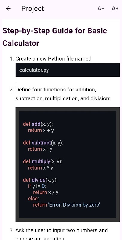• ایده های کامل پروژه پایتون با پیاده سازی: مهارت های خود را با ساختن پروژه های پایتون در دنیای واقعی به سطح بعدی ببرید. برنامه ما ایده های پروژه کاملی را با پیاده سازی های گام به گام ارائه می دهد و به شما این امکان را می دهد تا آنچه را که آموخته اید به کار ببندید و پروژه های چشمگیری را برای نمونه کار خود ایجاد کنید.