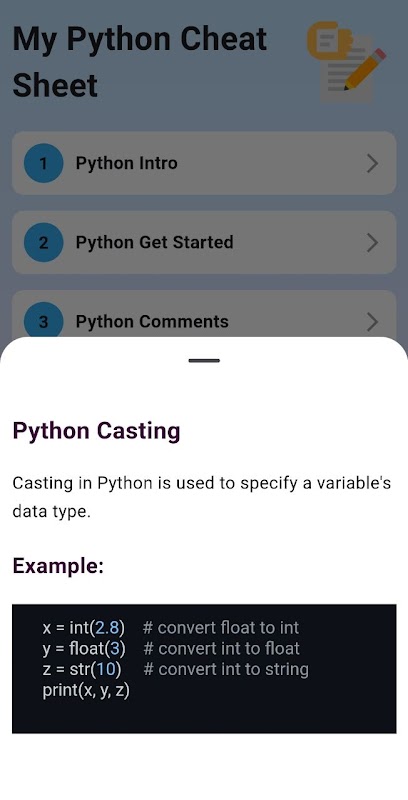 • برگه تقلب پایتون: به یک راهنمای مرجع سریع برای نحو، توابع و کتابخانههای رایج پایتون دسترسی پیدا کنید. هم برای مبتدیان و هم برای کدنویسان باتجربه که در حین کدنویسی نیاز به یک تجدید کننده مفید دارند.