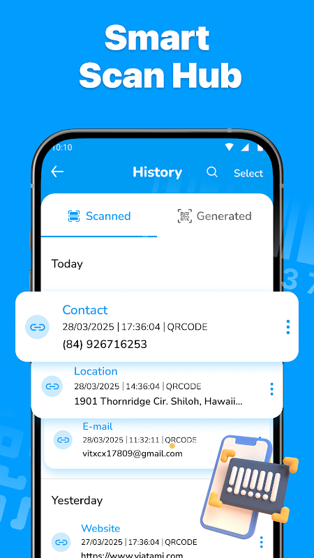 همه کدهای اسکن شده و کدهای QR تولید شده در یک تاریخچه اسکن ایمن ذخیره می شوند. برای بازیابی آسان، بر اساس تاریخ، نوع یا محتوا فیلتر کنید.