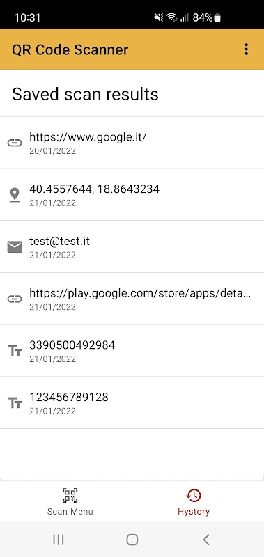 ✓ به راحتی تمام کدهای QR و بارکدهای اسکن شده توسط QR Code Reader را مشاهده کنید. تاریخ به وضوح سازماندهی شده است