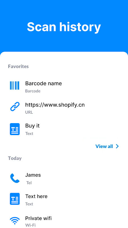 • Convenient and fast: You can quickly get contact information, website address, WIFI password, event details, etc.