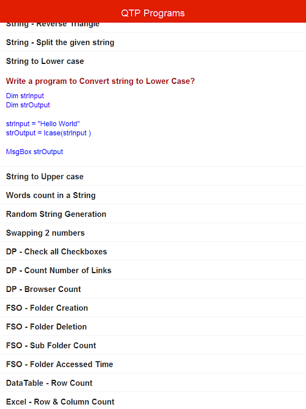 شما به ارمغان می آورد مجموعه ای از QTP و از VBScript برنامه های بسته بندی شده به برنامه، که بسیار مفید برای هر کسی که می خواهد برای مصاحبه آماده و برای یادگیری برنامه نویسی QTP می باشد. و شما می توانید بر روی بروید آماده کند.