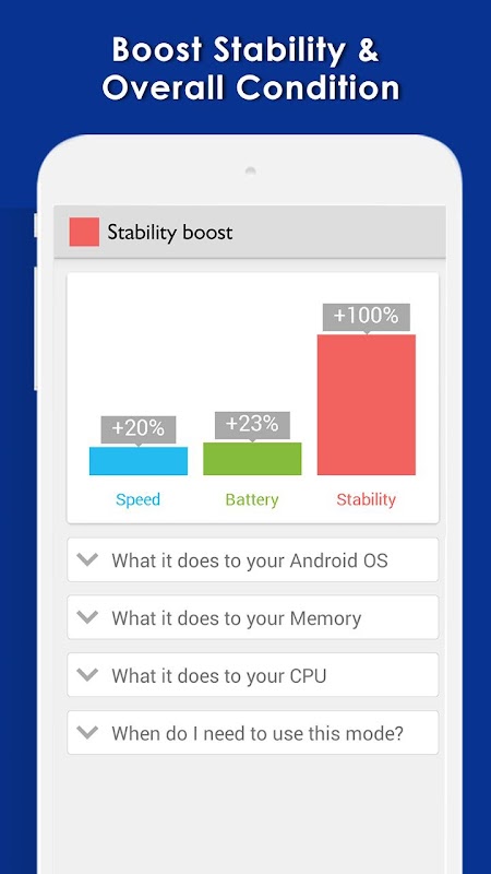 Stability Boost mode make your smart phone more stable in overall condition. This mode hibernates all the poorly programmed apps and settings to consume battery and processor speed, enhancing overall condition of your android smartphone.