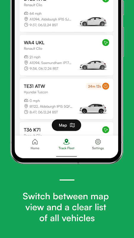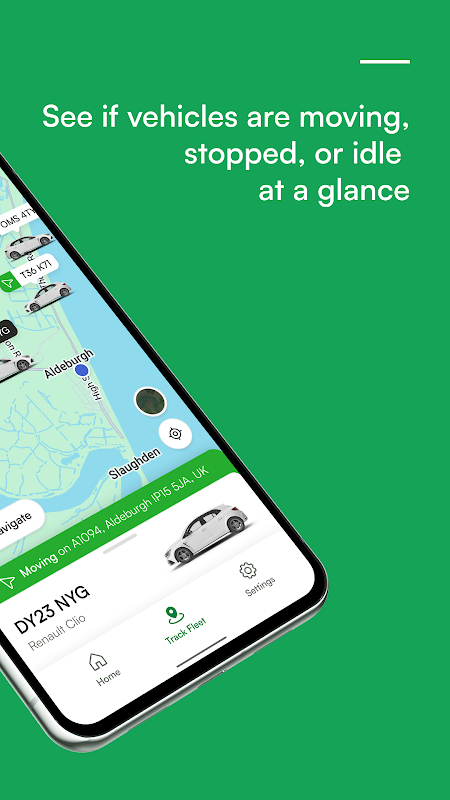 - داشبورد صفحه اصلی که نمای کلی از ناوگان شما را نشان می دهد، از جمله اینکه آیا وسایل نقلیه در حال حرکت هستند یا ثابت با احتراق روشن/خاموش و اعلان های مهم.