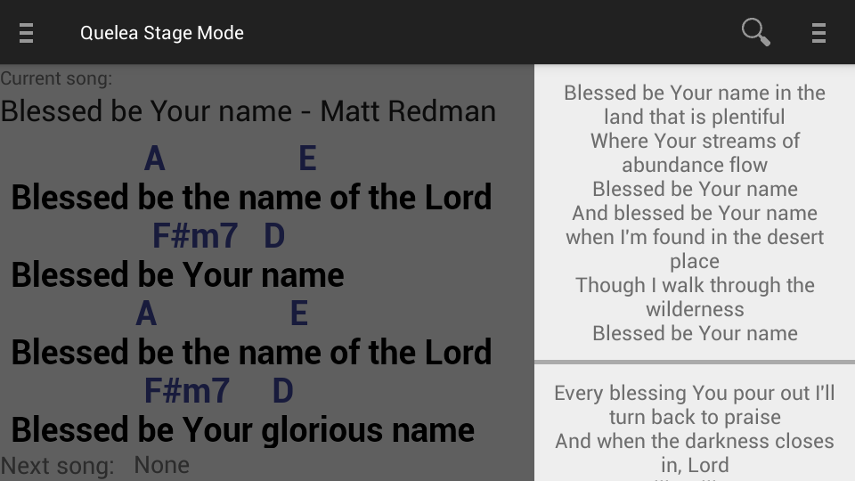 Quelea حالت مرحله یک ابزار برای رهبران عبادت است که به شما بیش از کلیسا رایگان نرم افزار طرح ریزی Quelea کنترل است. این ترکیبی از Quelea است ساخته شده در ویژگی های تلفن همراه از راه دور و تلفن همراه اشعار است، اقتباس به روی صحنه استفاده می شود.